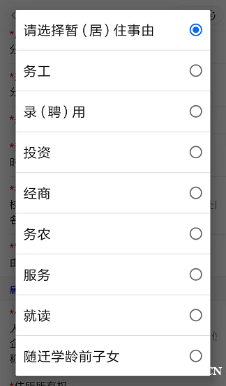 E.点击【暂(居)住事由】输入框,弹出选择窗口,点击可引用输入,如下图所示: